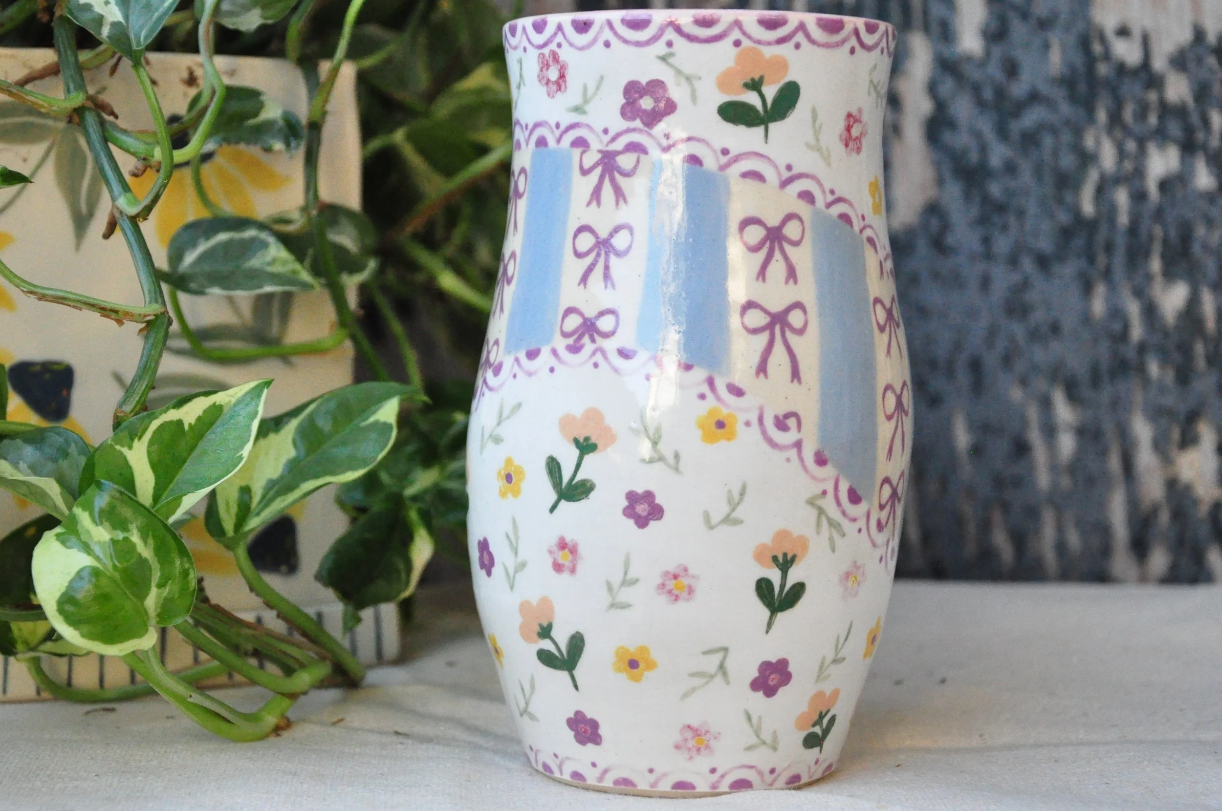 Vase with hand painted flowers and bows, a very coquette inspired design of fun, whimsical and girly aesthetic.
